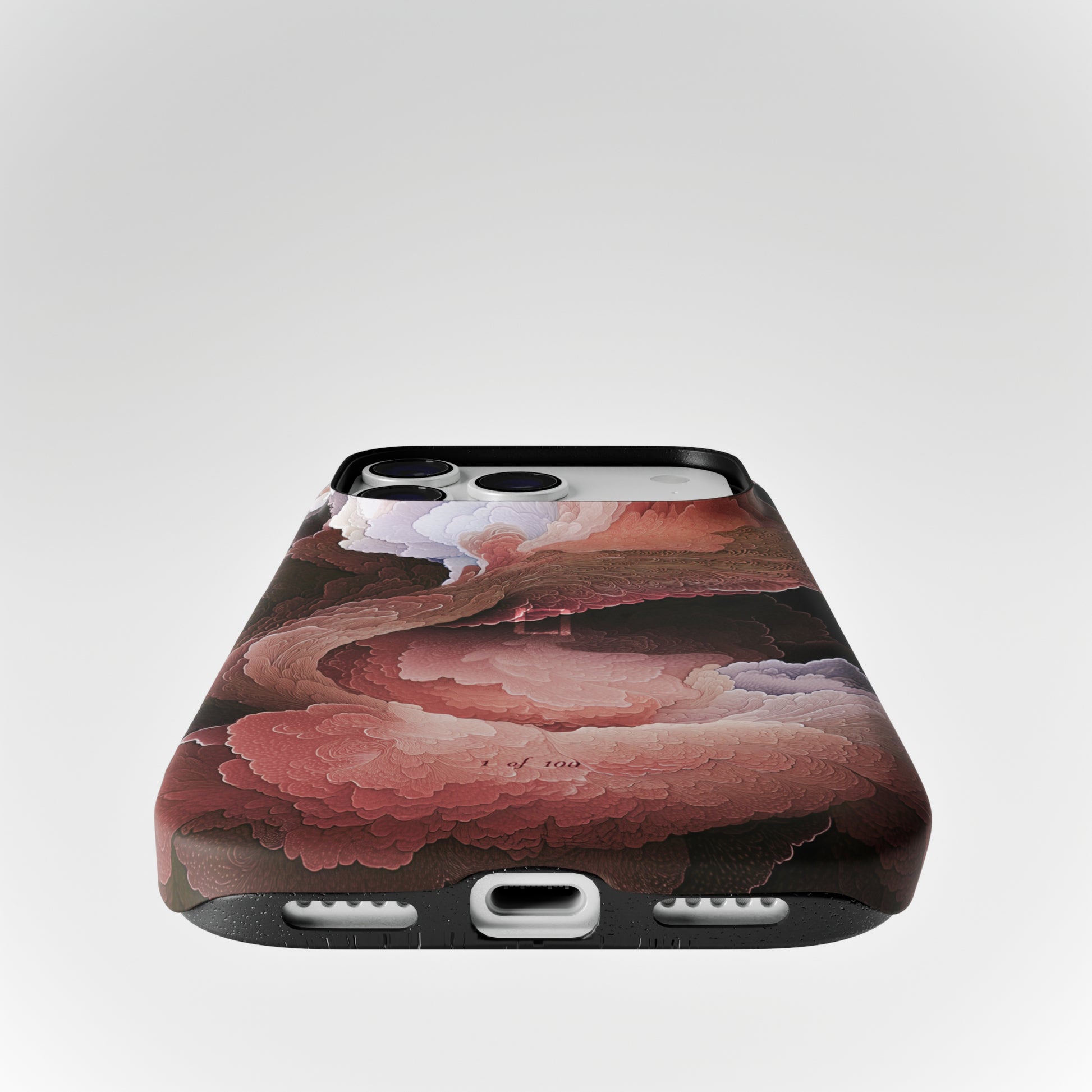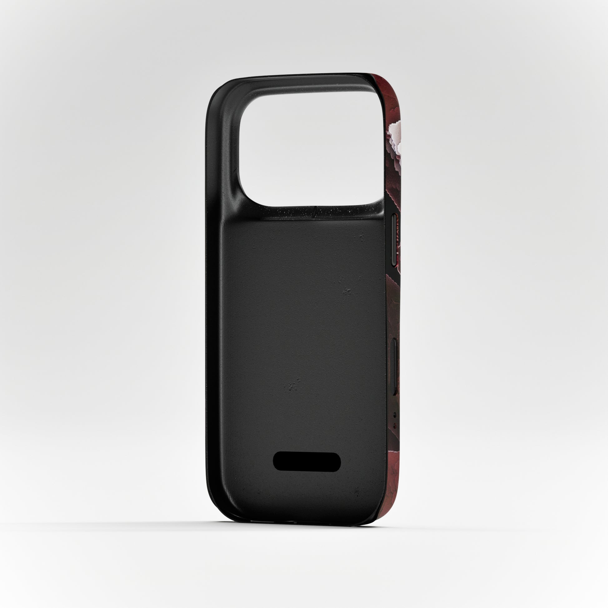 A bold red case etched with a feathery pattern — a symbol of permanence and identity.
